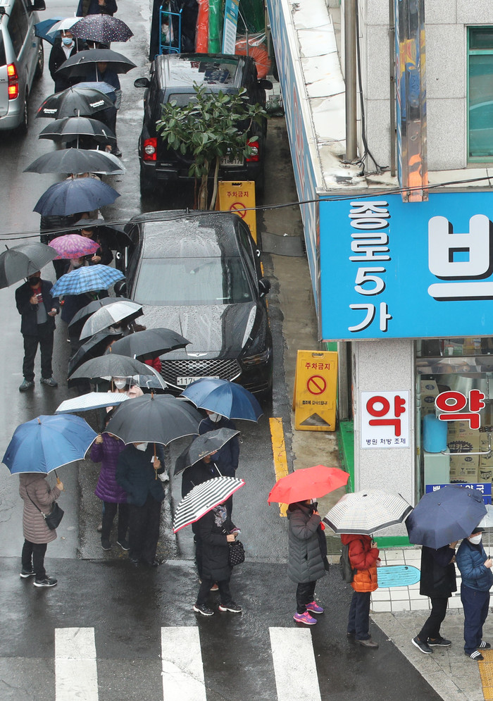 마스크 5부제 시행 이틀째인 10일 서울 종로5가 인근 한 약국에서 우산을 쓴 시민들이 공적 마스크 구매를 위해 줄을 서 있다.