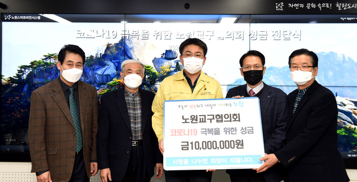 서울 노원구는 10일 구청장실에서 노원교구협의회로부터 코로나19 극복을 위한 성금 1000만원을 기탁받았다. 협의회 회원들은 '구민들에게 보탬이 되고자 한다'며 성금을 전달했다. 사진은 오승록 구청장(가운데)과 회원들이 기념촬영을 하는 모습. (사진제공=노원구청)