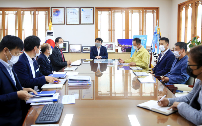 | ▲ 착수보고회에 참석한 맹정호 시장이 시 관계자들과 회의하고 있다. (사진제공=서산시청) |
