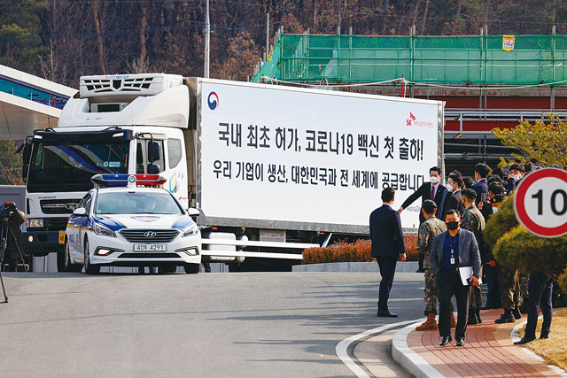 24일 경북 안동 SK바이오사이언스 공장에서 생산된 아스트라제네카 백신이 수송차량에 실려 군과 경찰의 호위를 받으며 보관창고로 이송되고 있다.