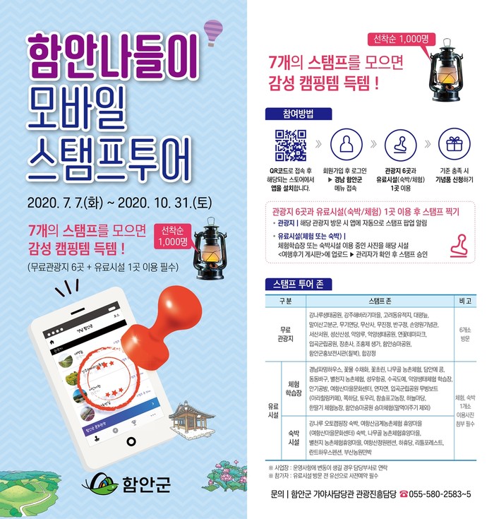 함안군은 문화체육관광부가 정한 특별여행주간을 맞아 침체된 여행업계의 분위기를 회복하고 관광객들에게 색다른 즐거움을 선사하고자 7월 7일 부터 7개의 관광지를 방문한 1,000명에게 관광기념품을 증정하는 ‘2020 함안나들이 모바일 스탬프투어’를 운영한다고 밝혔다.