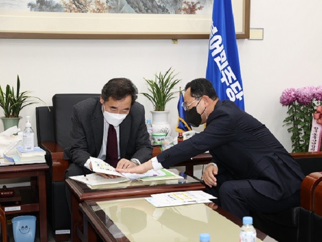 | ▲ 명현관 해남군수가 내년도 국비예산 확보를 위해 19일 국회를 방문, 이낙연 더불어민주당 대표에게 해남군 주요 현안사업에 대한 설명을 하고 있다. / 해남군 제공 |