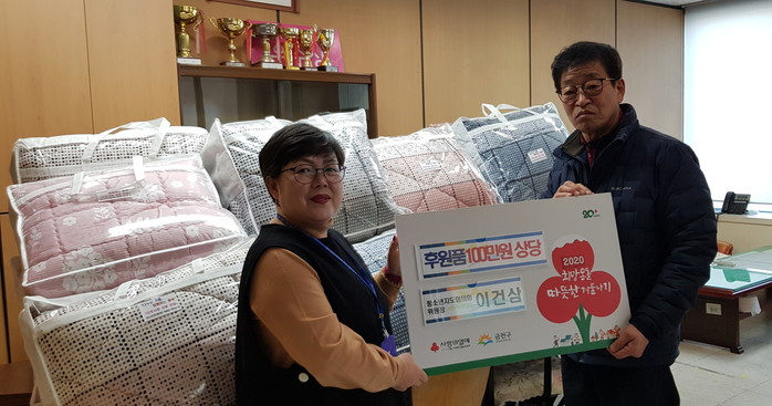 서울 금천구는 4일 가산동 주민센터에서 청소년지도협의회 이건삼 위원장이 후원물품을 기부하는 전달식을 개최했다. 이번 기부물품은 100만원 상당의 이불 26채로 저소득층 가구의 생활환경 개선을 위해 한부모가구에 전달될 예정이다. 사진은 관계자들이 기념촬영을 하는 모습.(사진제공=금천구청)