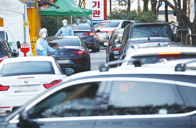 코로나19 신규 확진자가 23일 0시 기준으로 271명을 기록하며 엿새 만에 300명 아래로 내려온 가운데 23일 오전 경기 수원시 경기도의료원 수원병원에 설치된 선별진료소에 검사를 받으려는 차량이 줄을 서 있다.