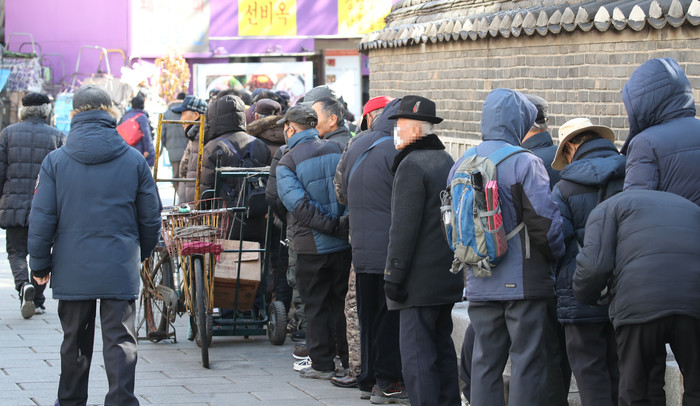 지난 12일 행정안전부가 발표한 주민등록 인구통계에 따르면 2019년 우리나라 주민등록 인구가 관련 통계 발표 시작 이후 가장 낮은 증가율을 보이며 제자리걸음을 한 가운데 고령화 추세는 더욱더 빨라졌다. 65세 이상 고령 인구수가 처음으로 800만명을 돌파했으며 14세 이하 유소년 인구와 15∼65세 생산가능인구는 줄면서 고령 인구와 유소년 인구수 격차는 156만명으로 벌어졌다. 13일 서울 종로구 노인무료급식소 앞에서 노인들이 점식식사를 위해 대기해 있다.