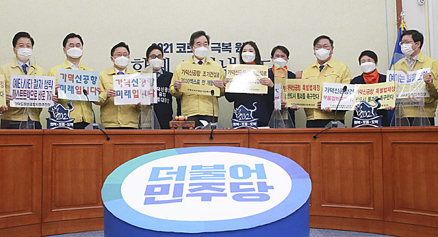 더불어민주당 이낙연 대표(가운데) 등이 24일 국회에서 가덕도허브공항시민추진단 이지후 상임대표로부터 가덕신공항특별법 통과 촉구 서한을 받은 뒤 함께 기념촬영하고 있다.