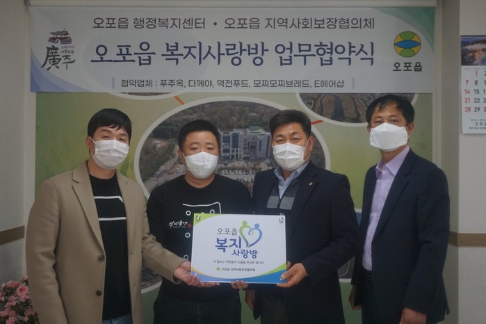 경기 광주시 오포읍행정복지센터는 3일 오포읍 지역사회보장협의체·푸주옥·역전푸드·모찌모찌브레드·E헤어샵·다께야와 함께 복지사각지대 발굴과 취약계층 지원을 위한 ‘2021년 오포읍 복지사랑방’ 업무협약을 체결했다. 사진은 협약식에서 관계자들이 기념촬영을 하고 있는 모습. (사진제공=광주시청)