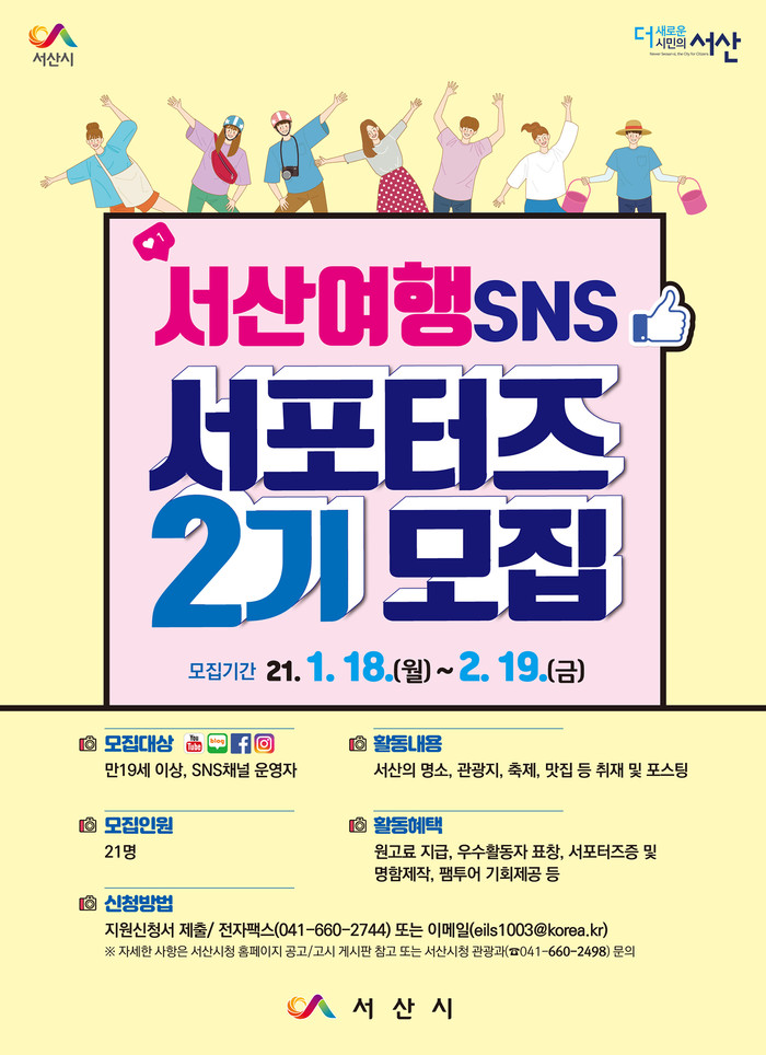 김일환 시 관광과장은 "제2기 서산여행 SNS 서포터즈 모집 및 운영 통해 서산의 다양한 매력을 특색있는 콘텐츠로 홍보할 것"이라며 "시민들의 많은 관심과 참여를 바란다"고 밝혔다.