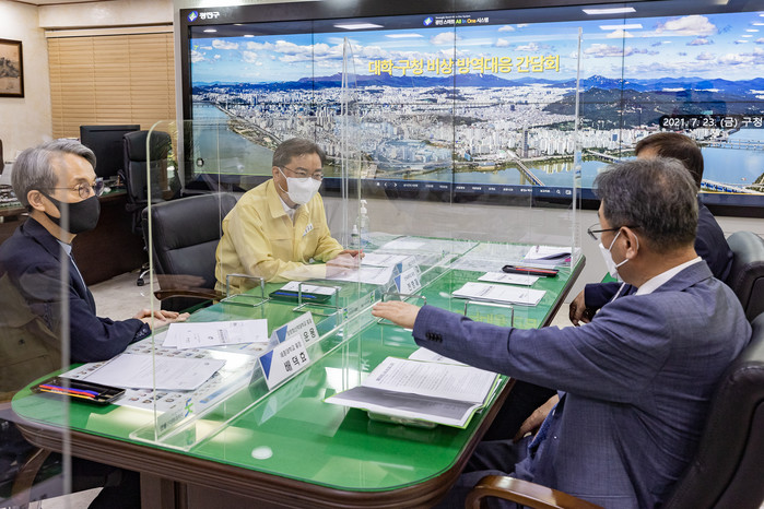 광진구가 지난 23일 코로나 확산 차단을 위해 지역내 건국대·세종대·장로회신학대과 '대학교 긴급 방역대책회의'를 개최했다. 회의에서는 최근 코로나 감염패턴 분석 결과를 공유하고, 공동대응 방안을 논의했다. 사진은 회의에서 김선갑 구청장(왼쪽 두 번째)이 3개 대학 총장들과 논의를 하고 있는 모습. (사진제공=광진구청)