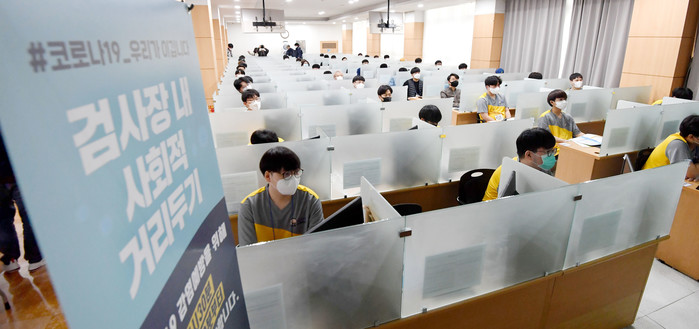 코로나19로 두 달 간 중단됐던 병역판정검사가 재개된 20일 오후 서울 영등포구 서울지방병무청에서 병역판정 검사 대상자들이 사회적 거리두기를 위해 한 자리씩 자리를 띄우고 앉아있다. 병무청은 검사 당일 검사자를 열화상 카메라와 체온계로 발열 여부를 확인하고 오한·기침 등 호흡기 이상 증상이 있는 경우 귀가 조치한다고 했다.