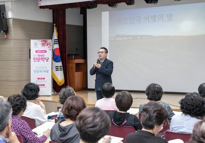 서울 강서구는 18일 강서평생학습관에서 ‘2019년 하반기 행복한 인문학당’ 개강식을 개최했다. 사진은 이날 인문학당 첫 번째 강사로 나선 노중훈 여행작가가 ‘숨어있는 식당을 찾아 떠나는 맛집 여행’을 주제로 강의하고 있는 모습. (사진제공=강서구청)
