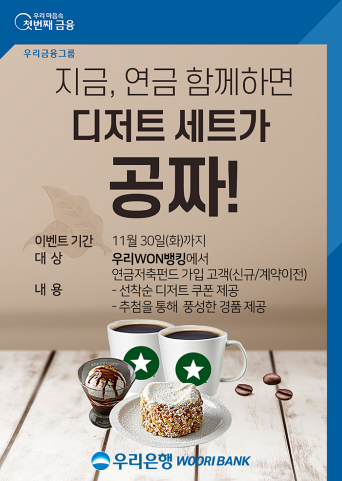 이번 이벤트 대상은 우리WON뱅킹에서 연금저축펀드를 ▲최초 신규가입하고 자동이체 5만원 이상 등록한 고객 ▲타 금융기관에서 우리은행으로 계약이전한 고객으로, 선착순 2만명에게 스타벅스 디저트 쿠폰을 제공한다.