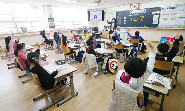 사회적 거리두기 단계 조정으로 등교 인원이 늘어난 19일 오전 인천 동구 창영초등학교 1학년 교실에 학생들이 수업에 열중하고 있다. 이 학교 1학년 전원은 이날 모두 등교했다.
