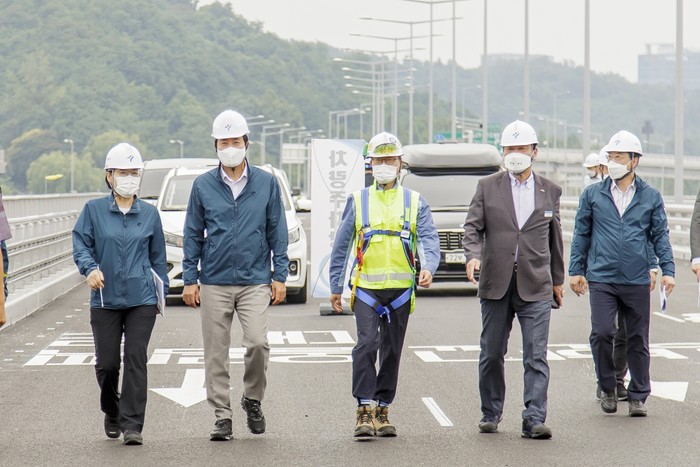 오세훈 서울시장과 유동균 마포구청장은 지난 29일 9월1일 월드컵대교 개통을 앞두고 현장 점검을 실시했다. 사진은 오 시장(왼쪽 두 번째)과 유 구청장(오른쪽 두 번째)이 점검단과 함께 월드컵대교를 둘러보고 있는 모습. (사진제공=마포구청)
