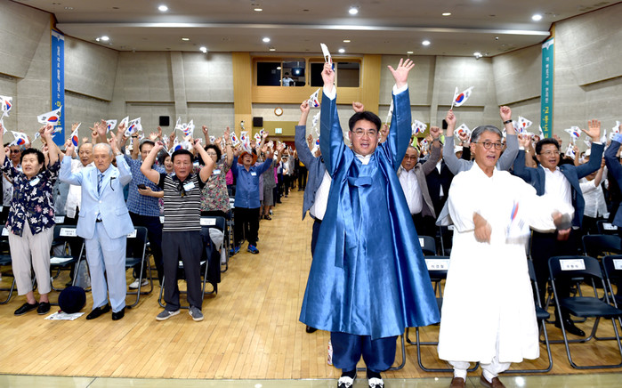 서울 노원구가 최근 광복절을 맞이해 국가와 민족을 위해 희생한 애국지사들의 헌신에 감사하기 위해 구청 대강당에서 ‘제74주년 광복절 경축식’을 개최했다. 사진은 오승록 구청장(오른쪽에서 두 번째)과 행사 참석자들이 '만세삼창'을 하는 모습. (사진제공=노원구청)