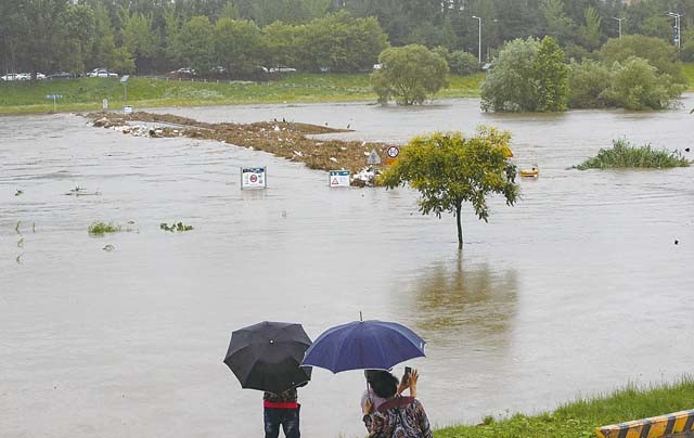 대전지방 집중호우로 홍수주의보가 발령된 13일 오전 대전시 대덕구 오정동 대전천에 물이 불어나자, 산책 나온 시민들이 휴대폰 찰영을 하고 있다.
