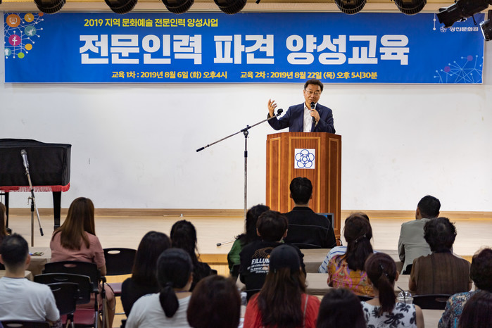 서울 광진구는 22일 2회에 걸친 ‘지역 문화예술 전문인력 양성교육’을 마치고 100여명의 청·중년 문화예술인을 양성했다. 사진은 양성교육에 참여한 김선갑 구청장이 인사말을 하고 있는 모습.(사진제공=광진구청)