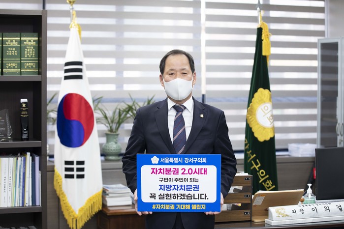 [시민일보 = 홍덕표 기자] 서울 강서구의회 이의걸 의장이 20일 자치분권 2.0시대 ‘자치분권 기대해’ 챌린지에 동참했다.