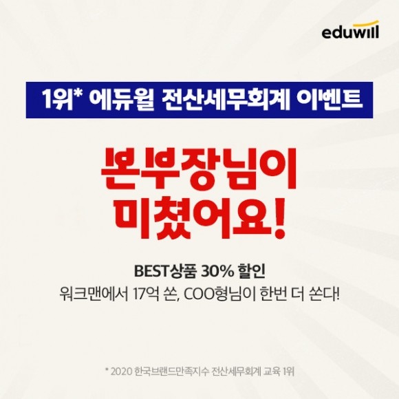 오는 29일까지 진행되는 에듀윌 전산세무회계 ‘본부장님이 미쳤어요! 이벤트’는 0원 합격반 전산회계 2급, 0원 합격반 전산회계 1급, 0원 합격반 전산세무 2급, 0원합격반 전산세무 1급, 0원 동시합격반 5개 과정에 전부 30% 할인 혜택을 제공한다.