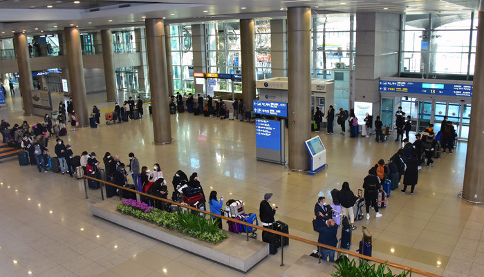 유럽에서 국내로 들어오는 입국자에 대한 검역 절차가 강화된 22일 오후 인천국제공항 1터미널에서 독일 프랑크푸르트발 여객기를 타고 입국한 승객들이 진단 검사를 받는 곳으로 이동하는 차량으로 향하고 있다./연합뉴스