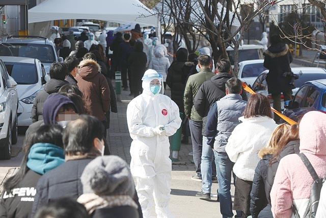 17일 경기 남양주시 진건읍 진관산업단지에서 근로자들이 신종 코로나바이러스 감염증(코로나19) 검사를 위해 줄지어 대기하고 있다. 이 산업단지의 한 공장에서 직원 114명이 코로나19 확진 판정받았다.