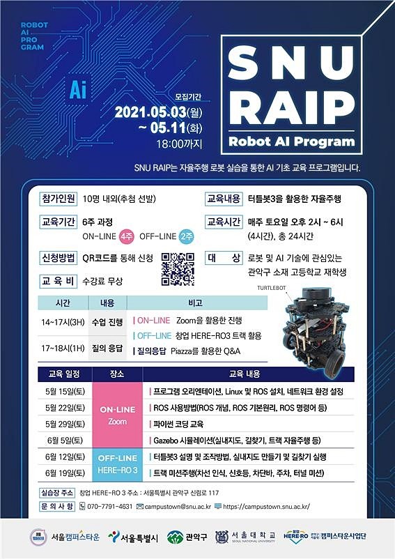 이번 프로그램은 로봇 및 AI 기술에 관심있는 관악구 소재 고등학교 재학생 대상으로 ▲ROS사용방법 ▲파이썬 코딩 ▲Gazebo 시뮬레이션 등의 4주간 온라인 교육과 ▲로봇 조작방법 ▲실내지도 만들기 및 길찾기 실행 ▲트랙 미션주행 등 2주간 오프라인 교육의 총 6주간 과정으로 진행된다.