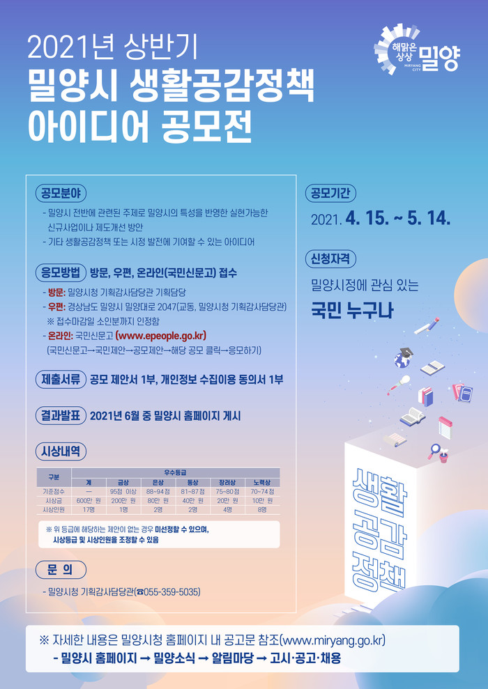 밀양시는 4월 15일부터 5월 14일까지 2021년 상반기 밀양시 생활공감정책 아이디어 공모전을 개최한다고 밝혔다.