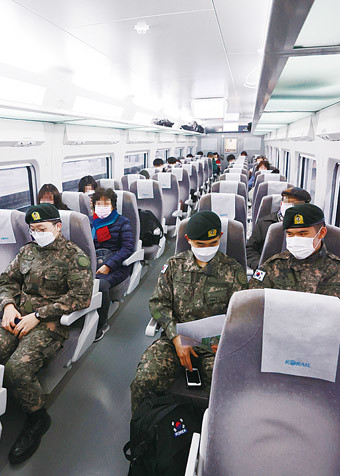 15일 서울역 승강장에서 출발을 앞둔 부산행 KTX 산천 열차에 이날부터 휴가 제한이 풀린 군 장병들이 좌석에 앉아 있다. 군 장병의 휴가는 지난해 11월27일 신종 코로나바이러스 감염증(코로나19) 확산 방지를 위해 통제를 시작한 지 80일 만인 이날부터 가능해졌다.