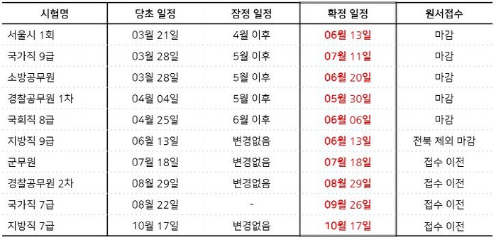 4월 4일 시행예정이었던 제1차 경찰공무원 필기시험은 5월 30일 치러지며, 당초 국가직 9급 필기시험 일정과 같았던 소방공무원 필기시험은 6월 20일 치러져 국가직 9급보다 앞서 치러질 예정이다.