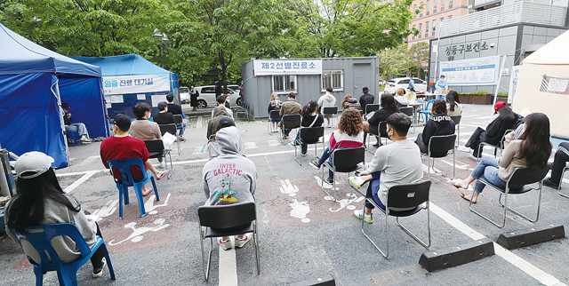 보건당국이 이태원 클럽 관련 전국 코로나19 확진자가 101명이라고 발표한 12일 서울 성동구 보건소에 이태원을 방문했던 시민들이 검사를 위해 대기하고 있다.