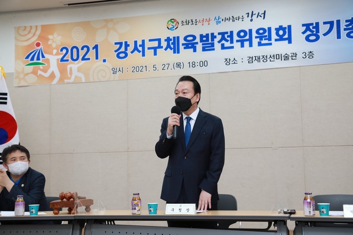 노현송 서울 강서구청장이 27일 강서구체육발전위원회 정기총회에 참석했다. 정기총회는 신규 임원에 대한 위촉장 수여를 시작으로 2020년 예산결산 감사보고, 2021년 사업계획(안) 보고 순으로 진행됐다. 사진은 정기총회에서 노 구청장이 발언을 하고 있는 모습. (사진제공=강서구청)