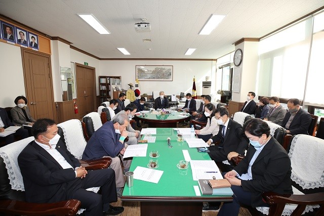 | ▲ 김병덕 해남군의회 의장, 27일 군의회의장실에서 해남동초등학교, 해남중학교 축구부 합숙소 폐쇄 결정으로 예상되는 문제점에 대한 해결책을 강구하기 위해 관계기관 단체장 및 관계자들과 간담회 주재 / 사진, 해남군의회 제공 |
