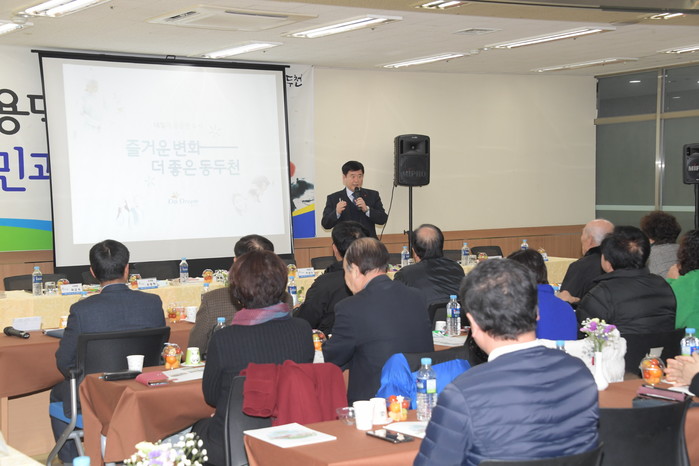 경기 동두천시는 경자년 새해를 맞아 9~10일 양일간 불현동, 송내동, 생연2동, 중앙동에서 '2020년 시민과의 대화'를 개최했다. 사진은 시민과의 대화에 참석한 최용덕 시장이 인사말을 하는 모습.(사진제공=동두천시청)