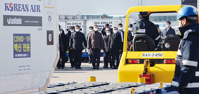 3일 오전 인천공항 대한항공 제2 화물터미널에서 진행된 신종 코로나바이러스 감염증(코로나19) 백신 유통 모의훈련 현장은 흡사 대테러 군사작전을 방불케 했다. 코로나19 백신의 안전한 수송·보관·유통을 위해 민·관·군·경이 함께하는 수송지원본부는 국내에 백신이 도착해 접종센터에 이르기까지 있을 수 있는 모든 돌발상황에 대비하며 유통 준비에 만전을 기했다. 문재인 대통령이 직접 참관한 가운데 진행된 모의훈련은 공항 내 단계, 운송 단계, 물류창고 보관 단계, 접종센터 운송·보관 단계 등 총 4단계로 구성됐다.