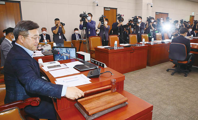 윤호중 국회 법제사법위원장이 16일 국회 법제사법위원회에서 미래통합당 의원들이 불참한 가운데 첫 전체회의를 개의하고 있다.