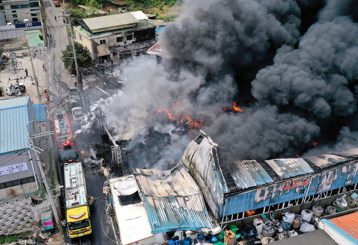 7일 오전 불이 난 경기도 김포시 통진읍 한 폐기물 재활용 업체에서 소방대원들이 진화작업을 벌이고 있다. 이 불로 업체 내부에 있던 1명이 부상하고 6명이 긴급히 대피했다.