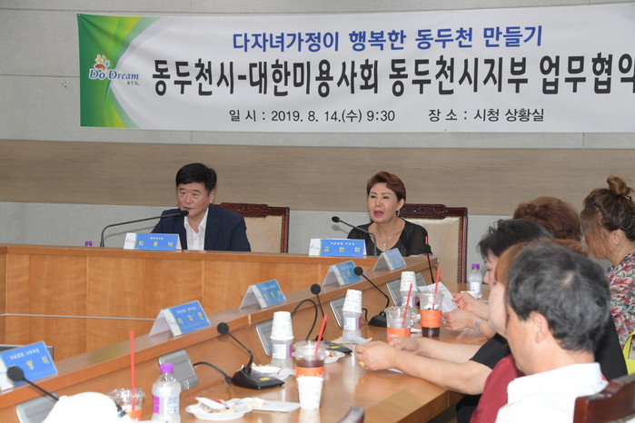 경기 동두천시는 최근 시청 상황실에서 대한미용사회 동두천시지부 고민화 지부장 및 임원진 등이 참여한 가운데 지역내 다자녀가정 미용 우대할인 혜택을 위한 업무협약을 체결했다. 사진은 최용덕 시장(왼쪽)이 관계자들에게 인사말을 전하는 모습. (사진제공=동두천시청)