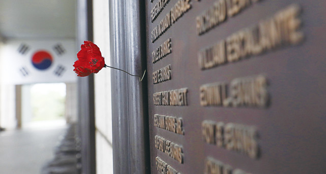 6.25 전쟁 70주년을 하루 앞둔 24일 용산 전쟁기념관 유엔군 참전용사 추모비에 조화가 꽂혀 있다.