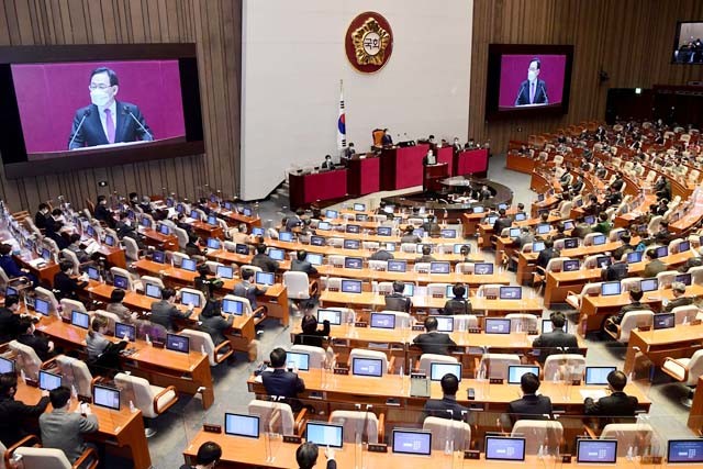 국민의힘 주호영 원내대표가 3일 국회 본회의에서 교섭단체 대표연설을 하고 있다.