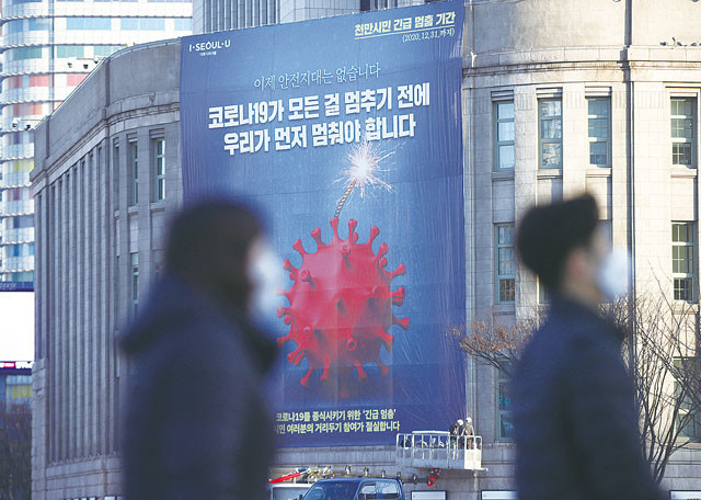 25일 오전 서울도서관 외벽에 천만 시민 긴급 멈춤 기간을 알리는 대형 현수막이 설치되고 있다.