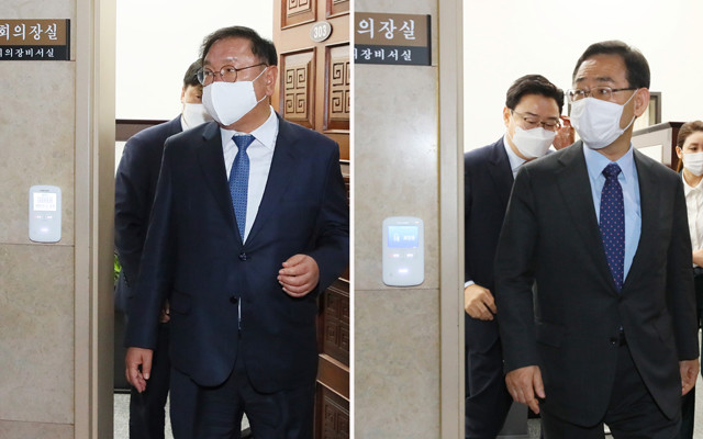 국회 상임위원회 구성이 지연되고 있는 가운데 더불어민주당 김태년 원내대표와 김영진 원내총괄수석부대표(왼쪽 사진), 미래통합당 주호영 원내대표와 김성원 원내수석부대표가 15일 국회 의장실에서 회동한 뒤 각각 의장실을 나오고 있다.