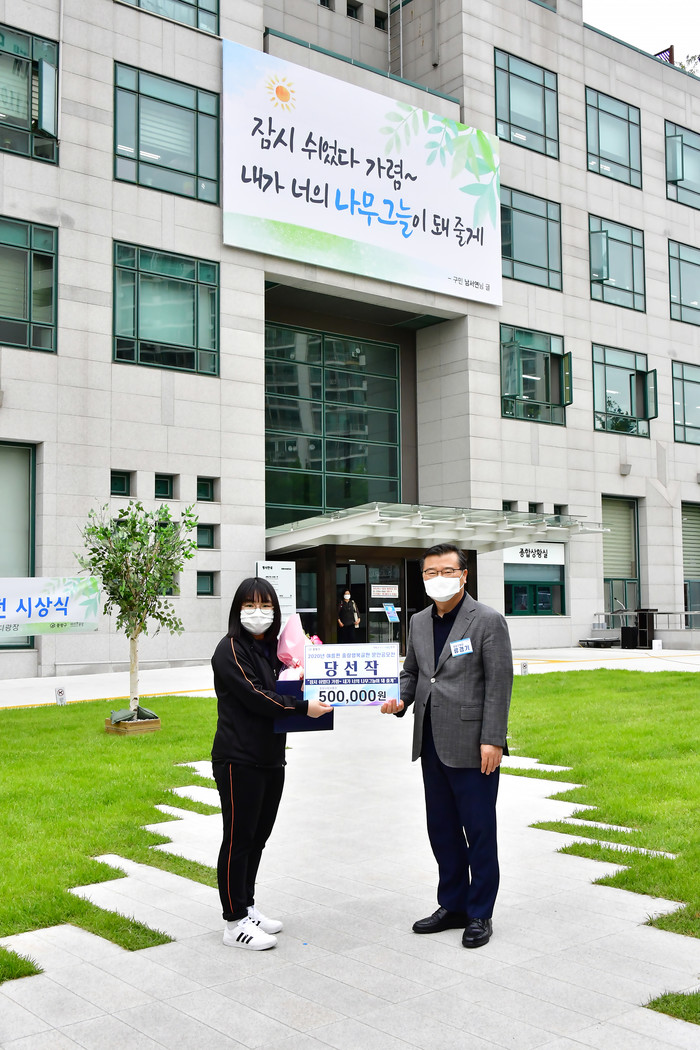 이번 공모전에 당선된 남서연 학생(신현고등학교 3학년)은 “언제 어디서나 기대어 쉴 수 있는 커다란 나무와 같은 든든하고 편안한 느낌을 구민들과 나누고 싶었다”고 창작 의도를 밝혔다.