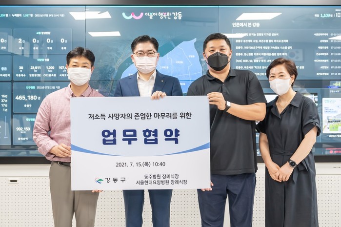 서울 강동구가 15일 저소득 무연고사망자를 대상으로 지역내 동주병원 장례식장, 서울현대요양병원 장례식장과 업무협약을 체결해 장례의식 제공과 안치료 지원에 대한 체계를 구축하고 지원을 시작했다. 사진은 협약식에서 이정훈 구청장(왼쪽 두 번째)과 관계자들이 기념촬영을 하는 모습. (사진제공=강동구청)