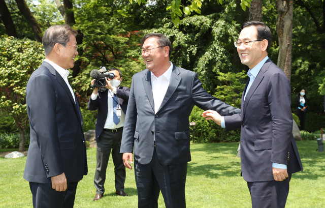 문재인 대통령이 28일 오후 청와대 상춘재에서 여야 원내대표 오찬 회동에 앞서 더불어민주당 김태년 원내대표(가운데), 미래통합당 주호영 원내대표와 대화하고 있다.