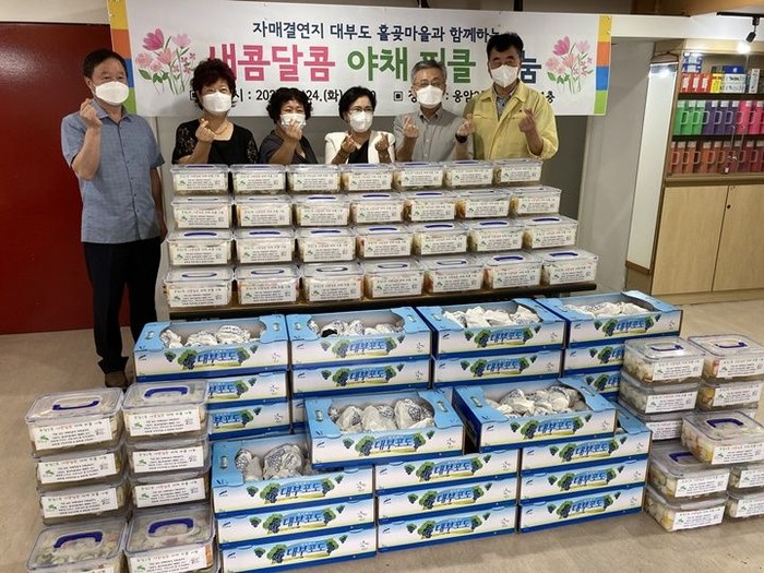 서울 은평구 응암2동 주민자치회는 최근 직접 만든 여름철 별미인 야채피클과 자매결연지인 흘곶마을 포도를 지역내 취약계층 100가구에 전달하는 ‘새콤달콤 야채 피클 나눔’ 행사를 개최했다. 사진은 행사에서 관계자들이 기념촬영을 하는 모습. (사진제공=은평구청)