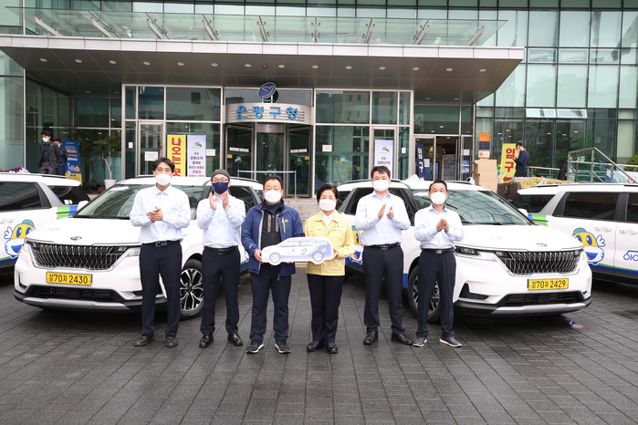 서울 은평구는 최근 신규증차 발대식을 시작으로 임산부 및 영·유아 자녀를 둔 가정을 위한 ‘아이맘택시’를 확대 운영한다. 아이맘택시는 대형승합 차량으로 운행하며 카시트 장착 등 이용편의는 물론 안전성까지 확보했다. 사진은 발대식에서 김미경 구청장(오른쪽에서 세 번째)과 관계자들이 기념촬영을 하는 모습. (사진제공=은평구청)