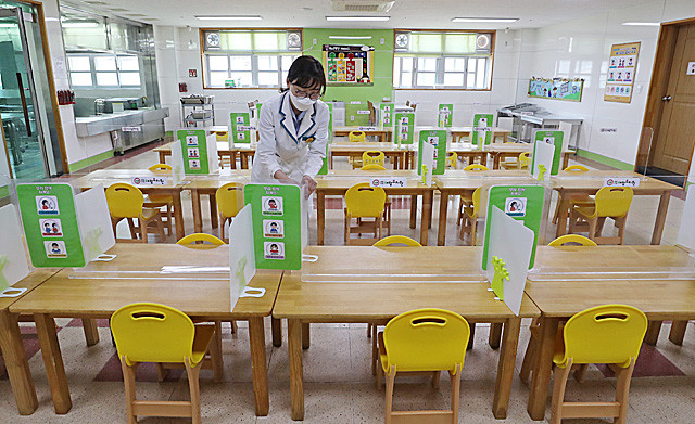 유치원 등원을 하루 앞둔 26일 오후 충남 아산 배방유치원에서 시설 관계자가 급식실 칸막이를 점검하고 있다.