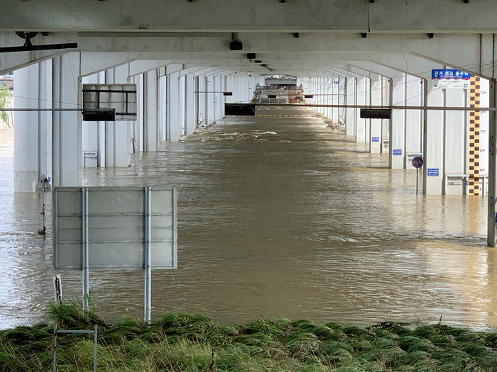 지난 10일 오전 서울 잠수교가 불어난 강물에 잠겨 있다. 잠수교는 지난 2일부터 불어난 강물에 통제되고 있다.