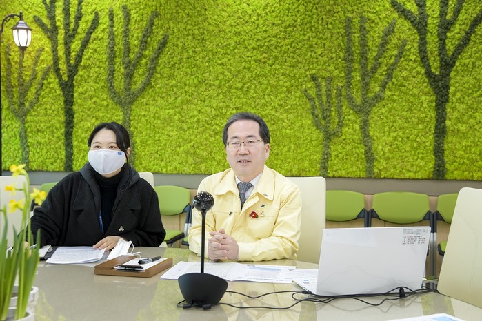 전남 순천시가 자매도시인 일본 이즈미시와 29일 영상회의를 통해 코로나19로 중단된 교류 활성화 방안을 논의하고, 그 일환으로 시가 추진 중인 '흑두루미 하늘길 연결 프로젝트'를 공동 추진하기로 합의했다. 사진은 허석 시장이 영상회의를 통해 프로젝트 공동 추진을 제안하는 모습. (사진제공=순천시청)