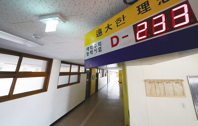 정부가 신종 코로나바이러스 감염증(코로나19) 확산으로 개학을 4월9일 이후로 연기하면서 대학수학능력시험(수능)과 수시·정시모집 등 대학 입시 일정도 미루기로 결정했다. 수능은 11월19일에서 12월3일로 2주 연기하고 대입 수시 학교생활기록부 작성 마감일도 8월31일에서 9월16일로 16일 늦췄다. 사진은 경기도 수원시의 한 고등학교 수능 디데이 전광판.